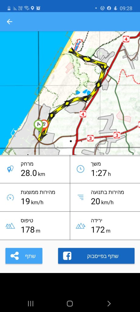 רכיבה עד כיכר מקיף ד', נפגשתי עם אחי חזי ורכבנו עד הגשר הצפוני, נפגשנו עם שאר הקבוצה אייל ומורן ולרכיבה הצטרף עופר כהן, רכבנו צפונה דרך הכביש עד באר גנים, ירדנו לשטח עד צומת ניצן והמשכנו עד חוף ניצנים, תמרים ונס קפה של אייל, היה חם מאוד וכל החוף היה מלא אוהלים ומבלים, אחרי חצי שעה רכבנו חזרה לאשקלון.