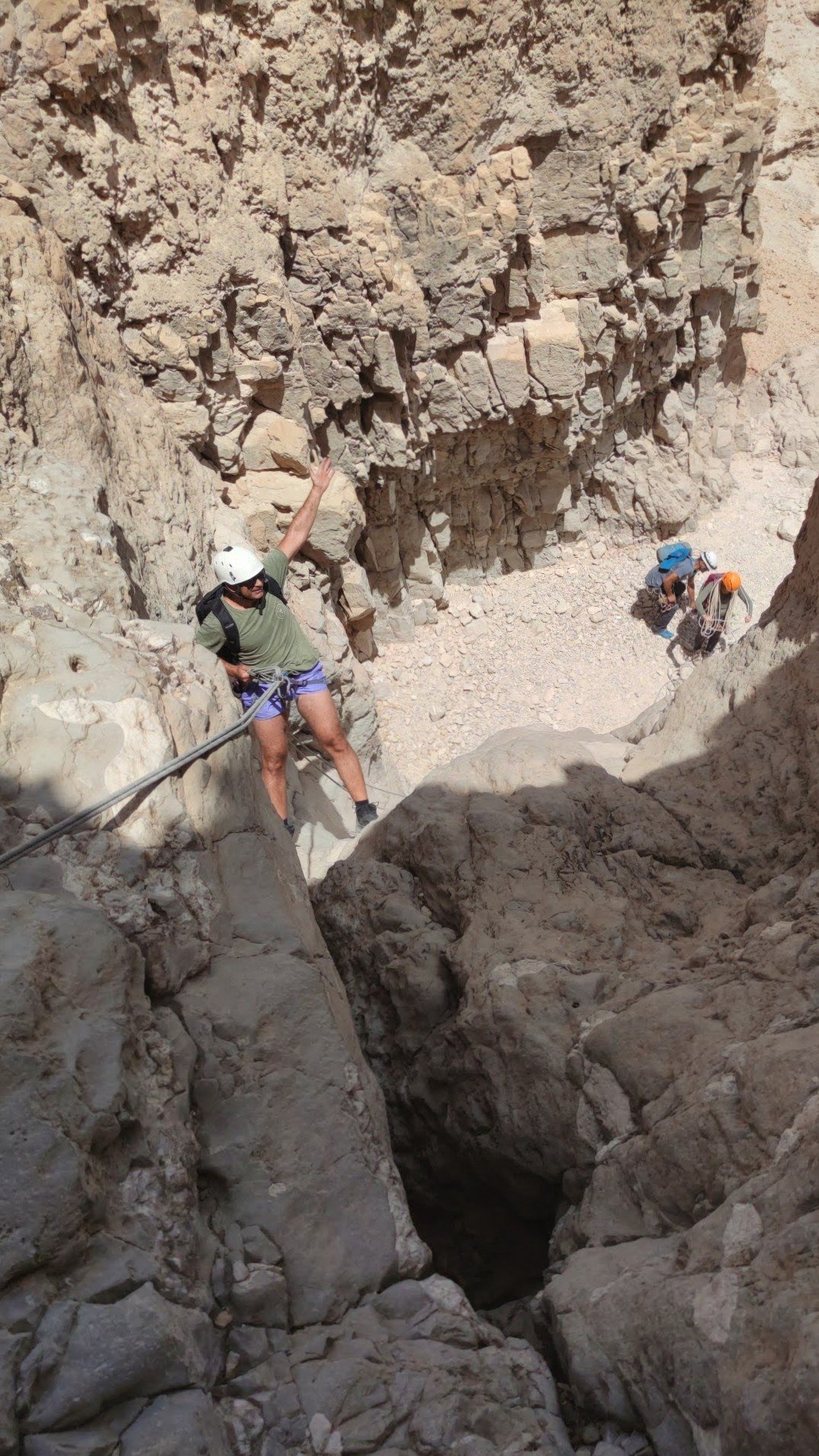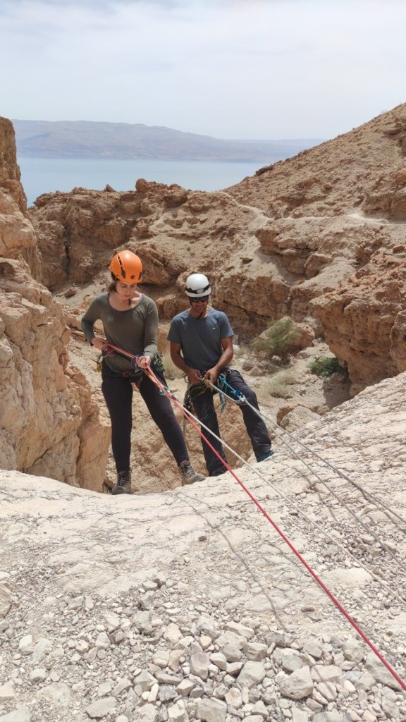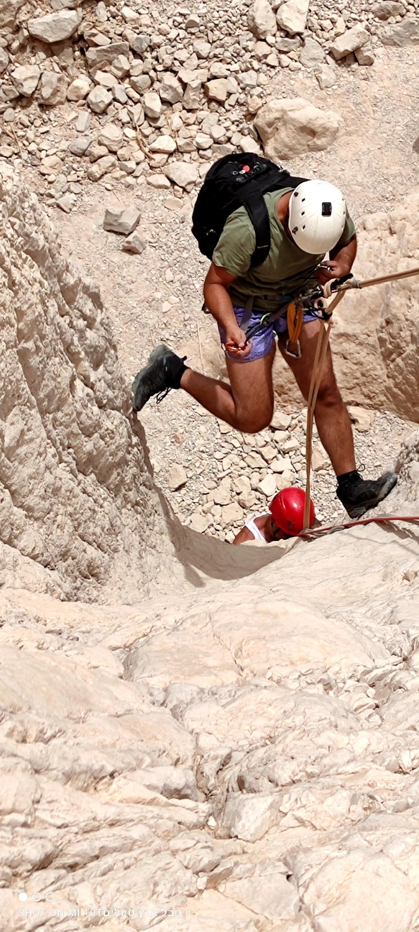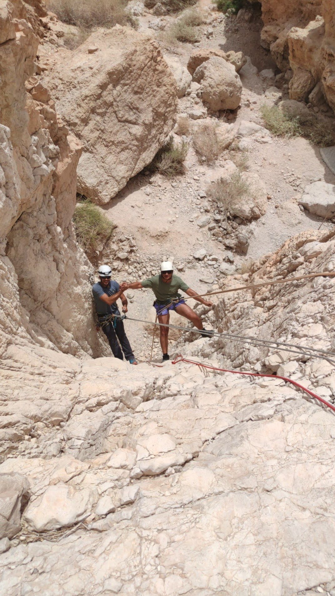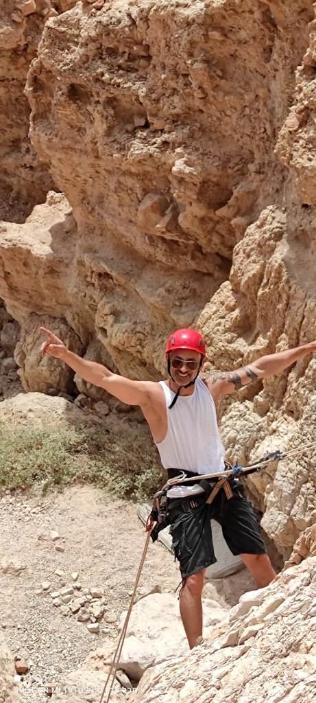 כמובן שבחצי השני נדחקתי לסוף התור, אנדריי גלש ראשון ואחריו טל ומוחמד, מכאן לא הצלחתי לברוח, פעם ראשונה מלחיצה ומפחידה הרגשתי שכל הגוף משתתק לי, הגלישה הייתה לי איטית מאוד וזכור לי שבאמצע המצוק לא הצלחתי להמשיך, מילות עידוד והכוונה משלומי וסיוע של אנדריי והמשכתי בגלישה עד סוף המצוק.