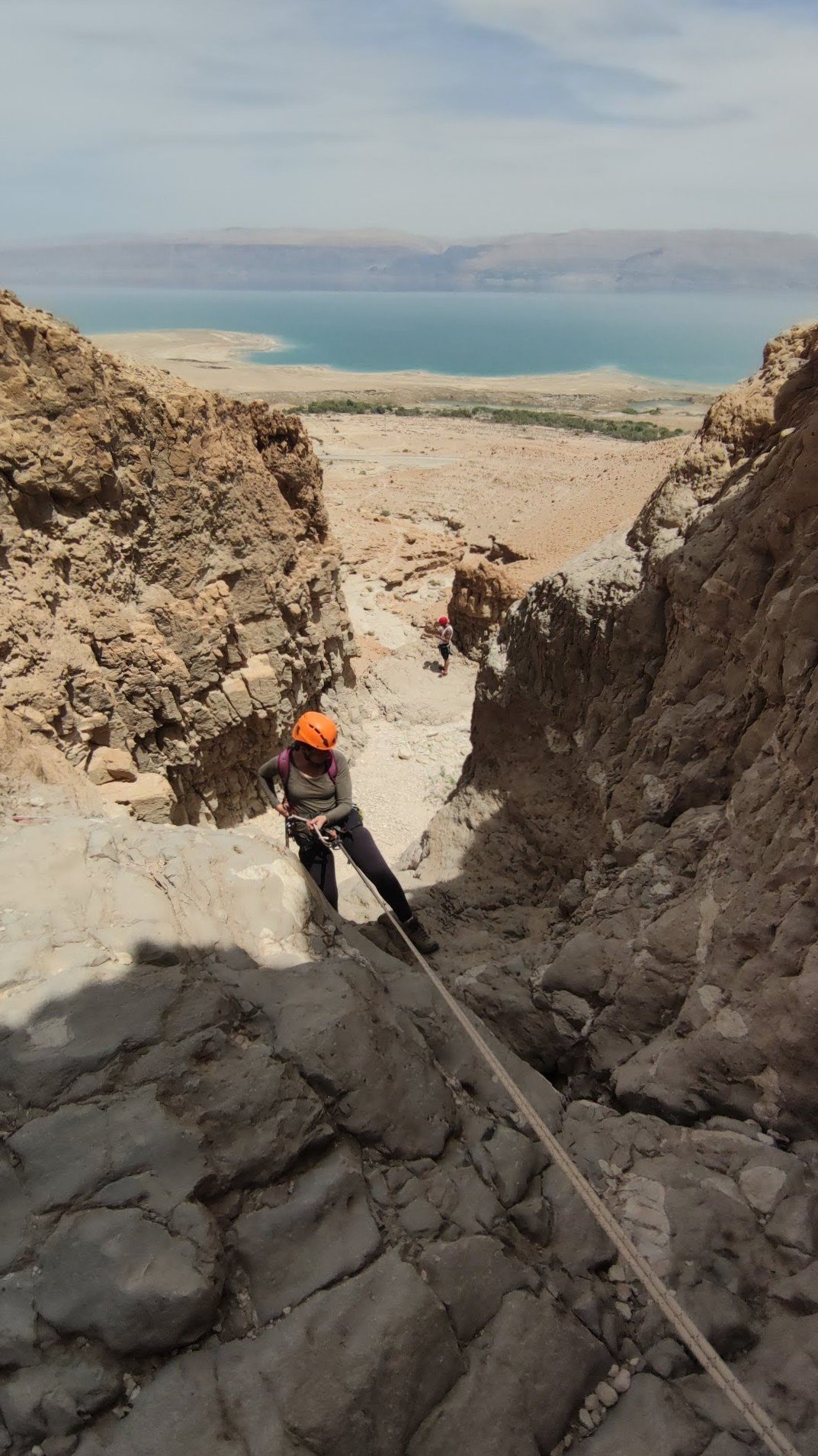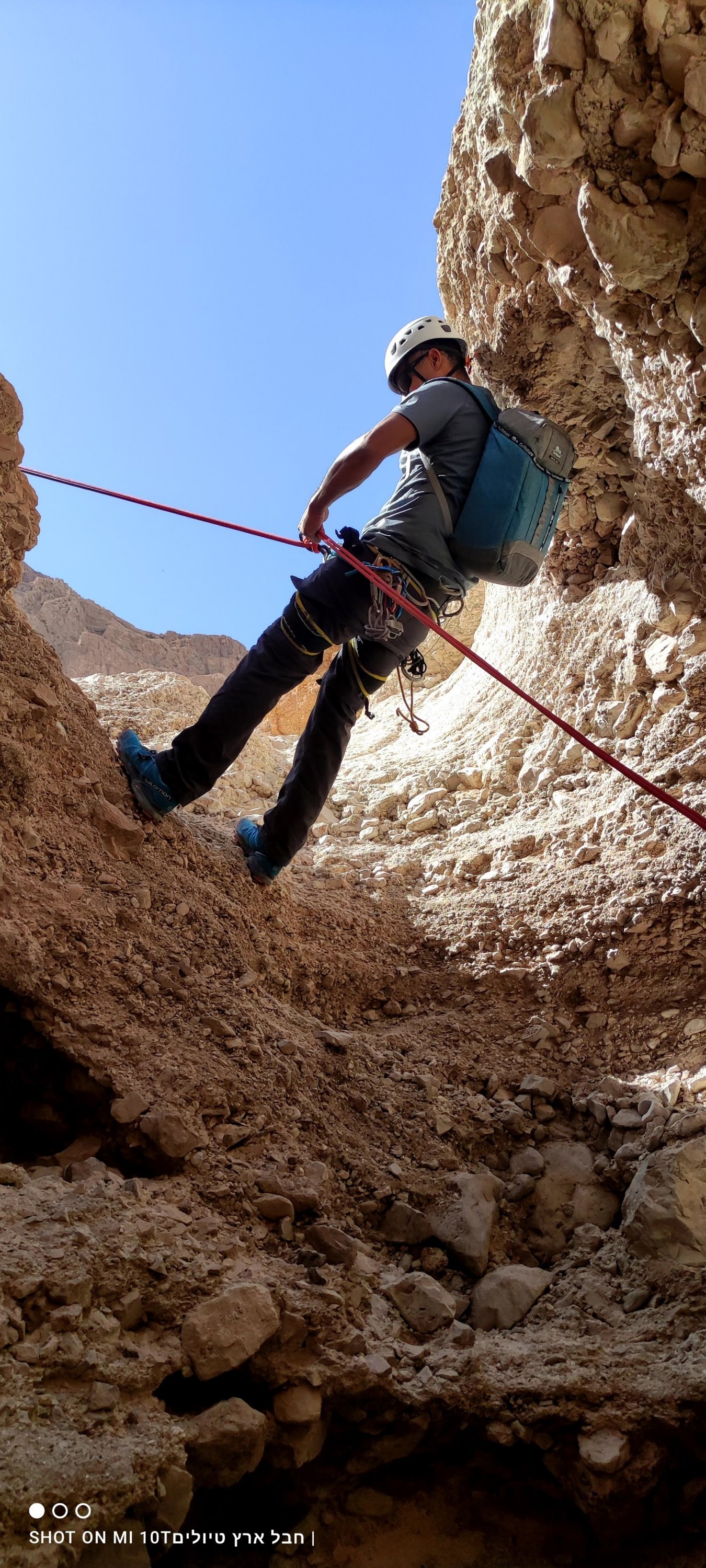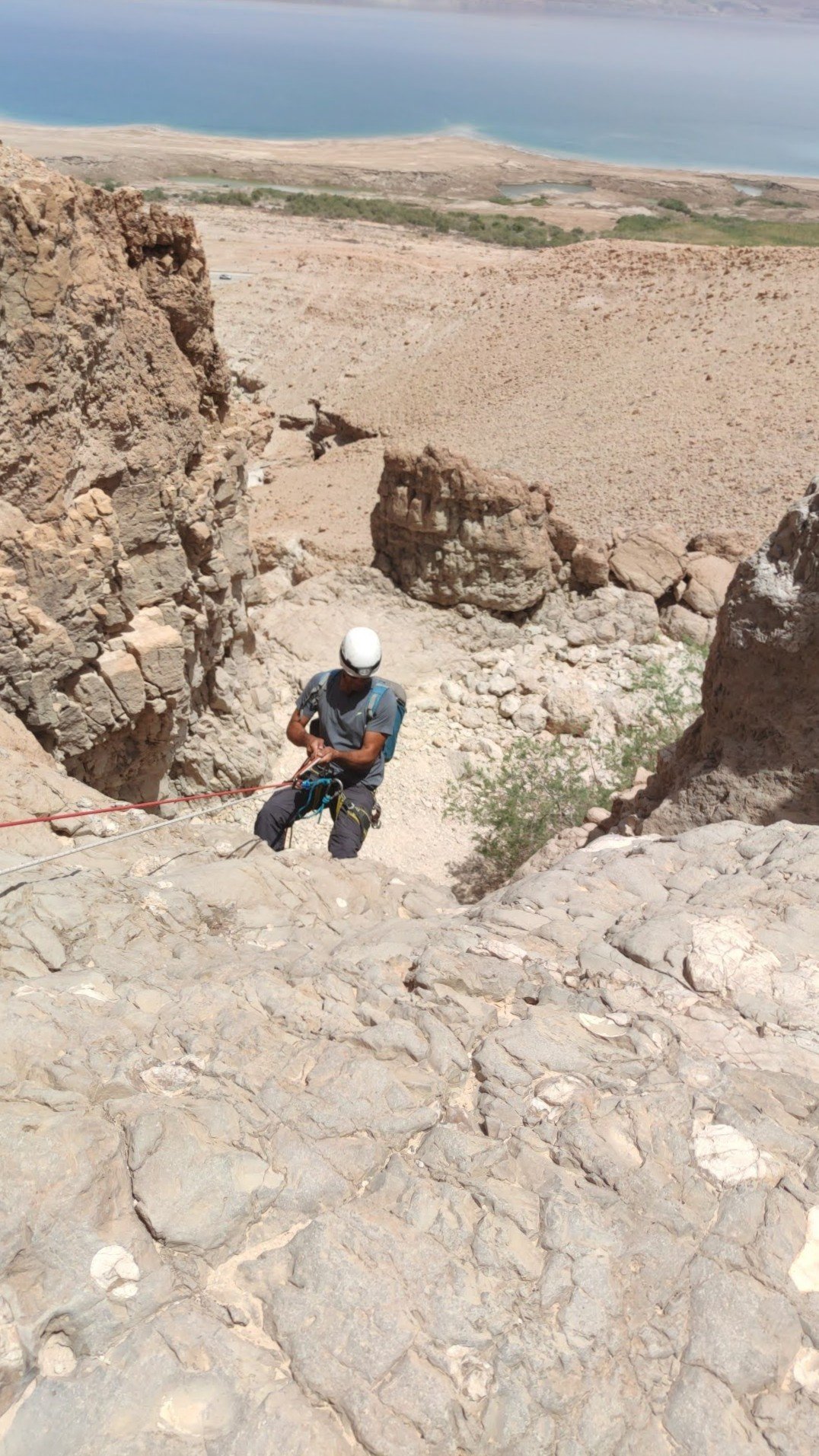 כמובן שבחצי השני נדחקתי לסוף התור, אנדריי גלש ראשון ואחריו טל ומוחמד, מכאן לא הצלחתי לברוח, פעם ראשונה מלחיצה ומפחידה הרגשתי שכל הגוף משתתק לי, הגלישה הייתה לי איטית מאוד וזכור לי שבאמצע המצוק לא הצלחתי להמשיך, מילות עידוד והכוונה משלומי וסיוע של אנדריי והמשכתי בגלישה עד סוף המצוק.