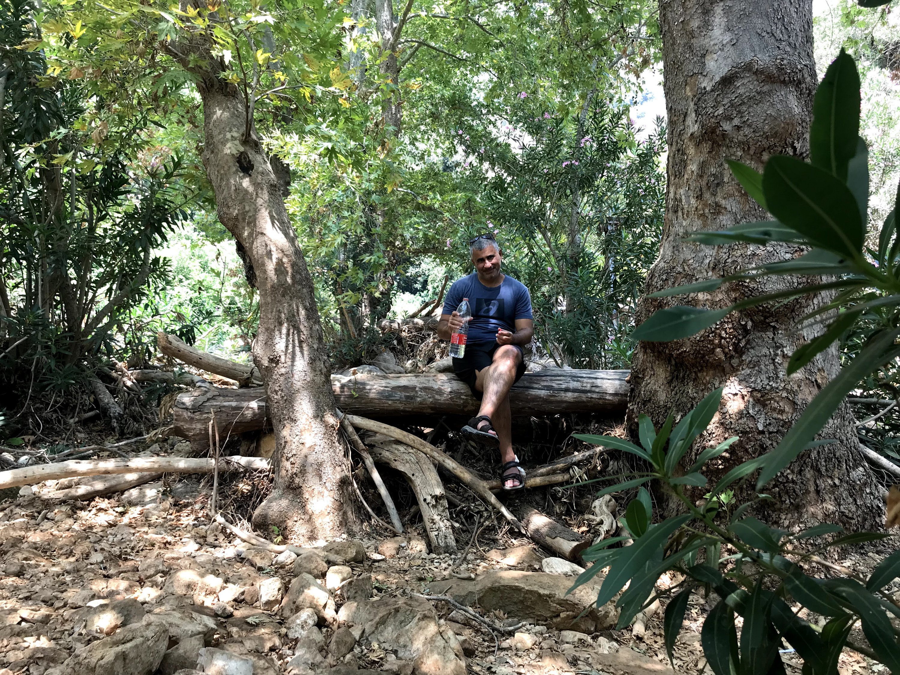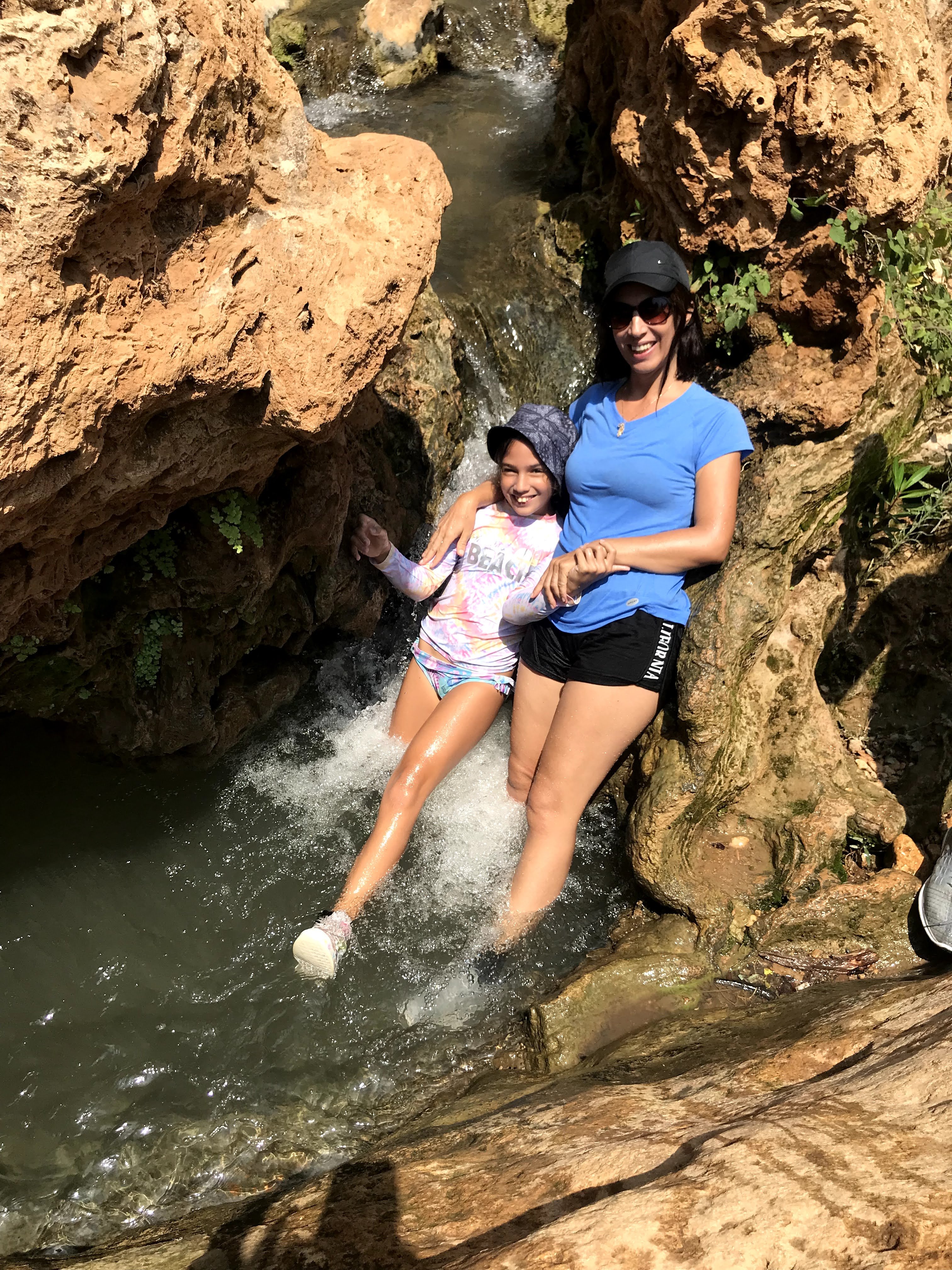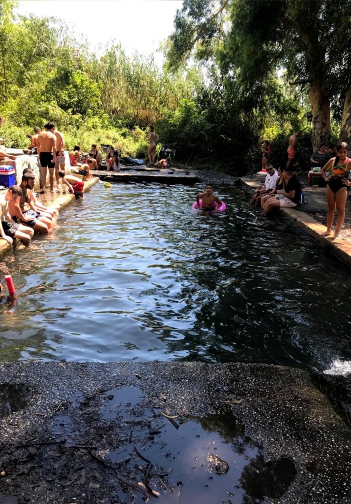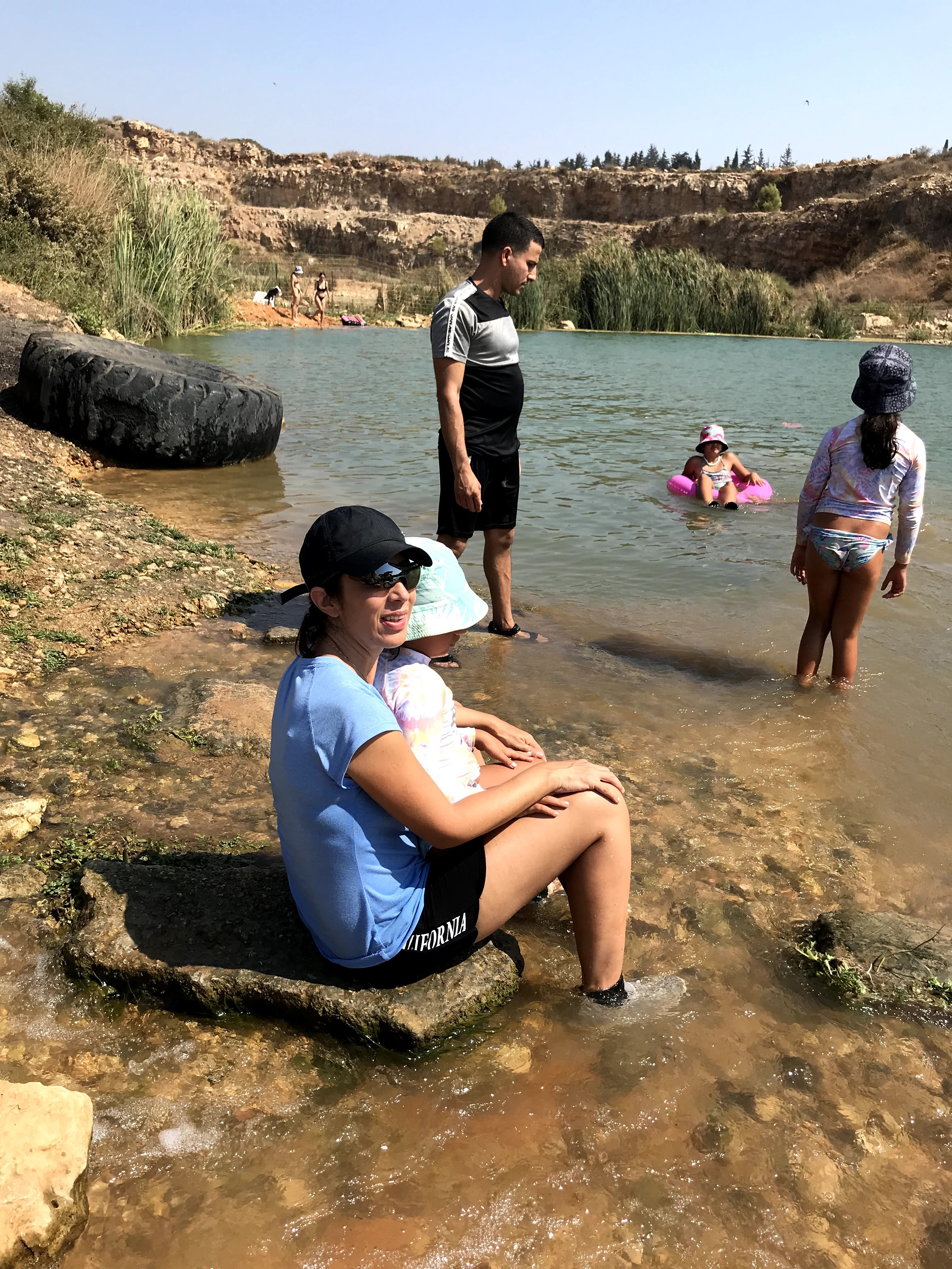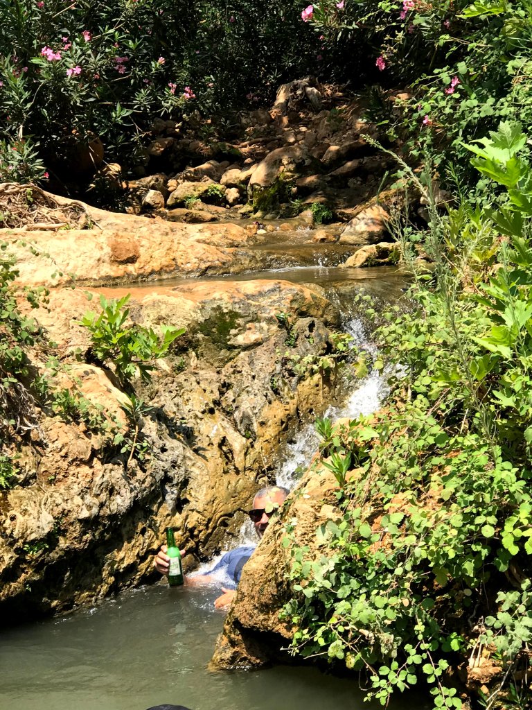 ירדנו דרך המדרגות אל עין עלאמין, נהר זרם מתחת לרגלנו, הנחנו את הציוד על שולחן עץ פנוי ונכנסנו להשתכשך בבריכה המדהימה והקרירה.