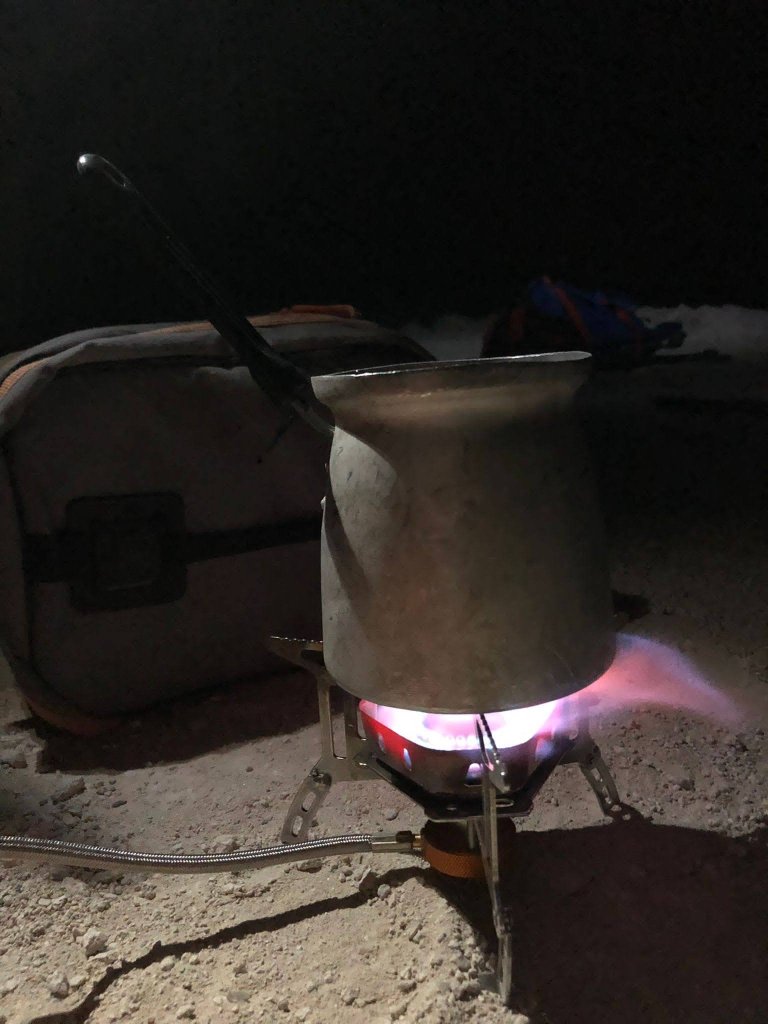 המשך הליכה טיול לילה בהר סדום דרך תצורות ההר ונצנוצי המלח עד הגעתנו לנקודת הקפה.הפסקת קפה שהכינו אביעד וינון, איציק ואשר התפנקנו באוכל מהטבע , בין לבין עצמנו עניים ושמרנו על השקט למספר דקות והתחברנו לטבע ,לחושך ולרוחות הנעימות שנשבו עלינו .