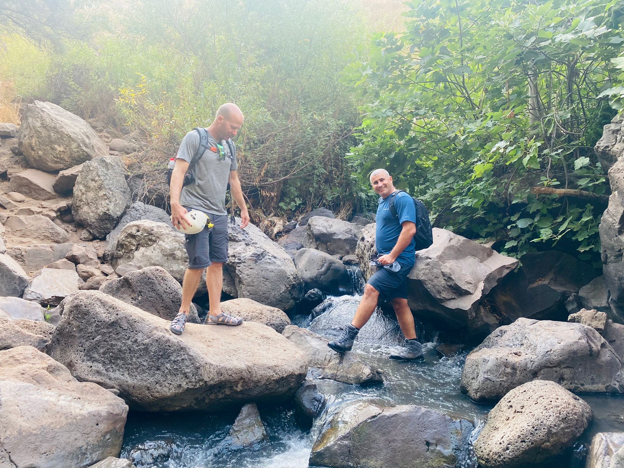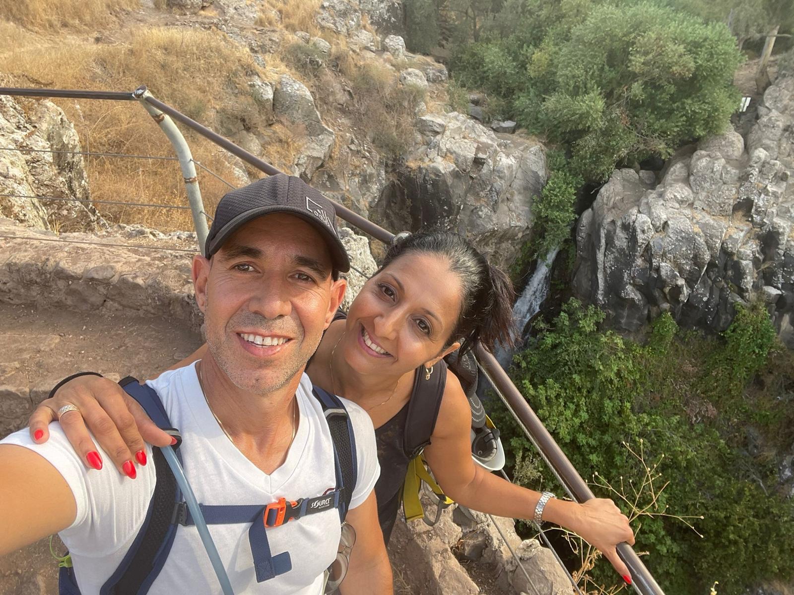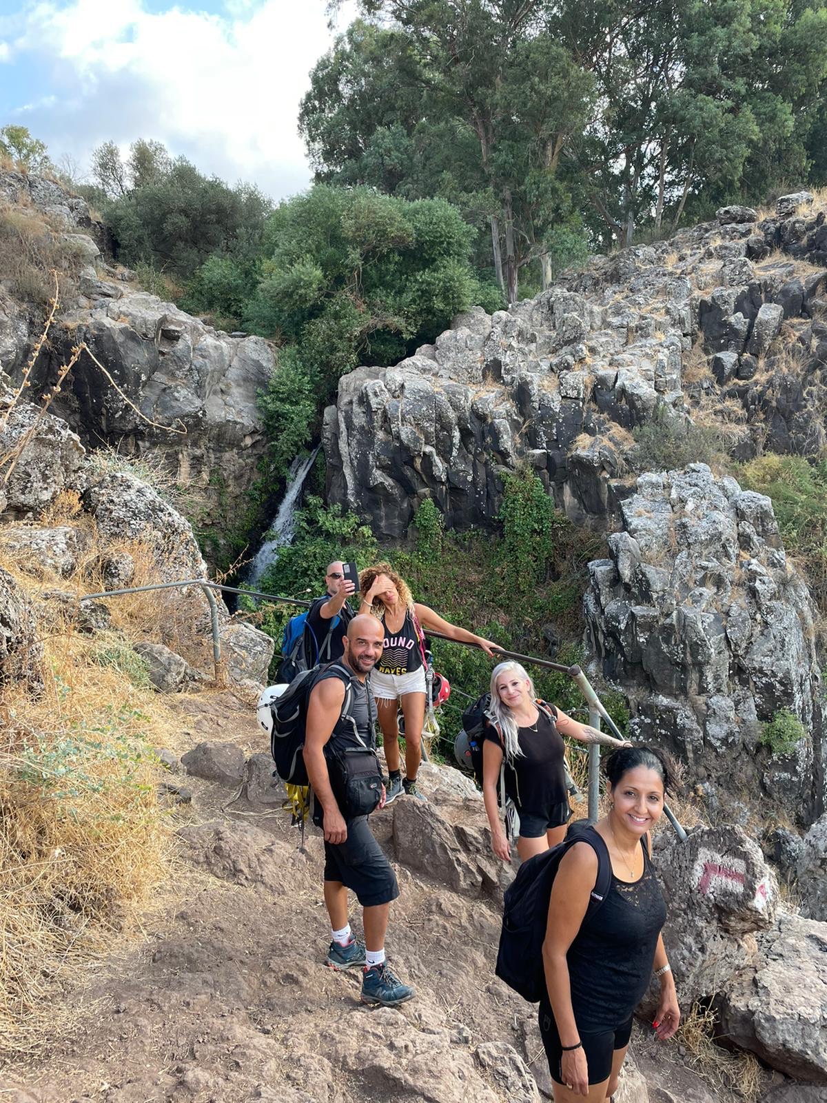 צפייה במפל במלוא הדרו , כמה פוזות למצלמה והמשך הליכה על ציר סמ״ש אדום בדרך למפל ג’ילבון