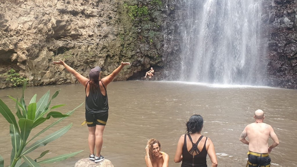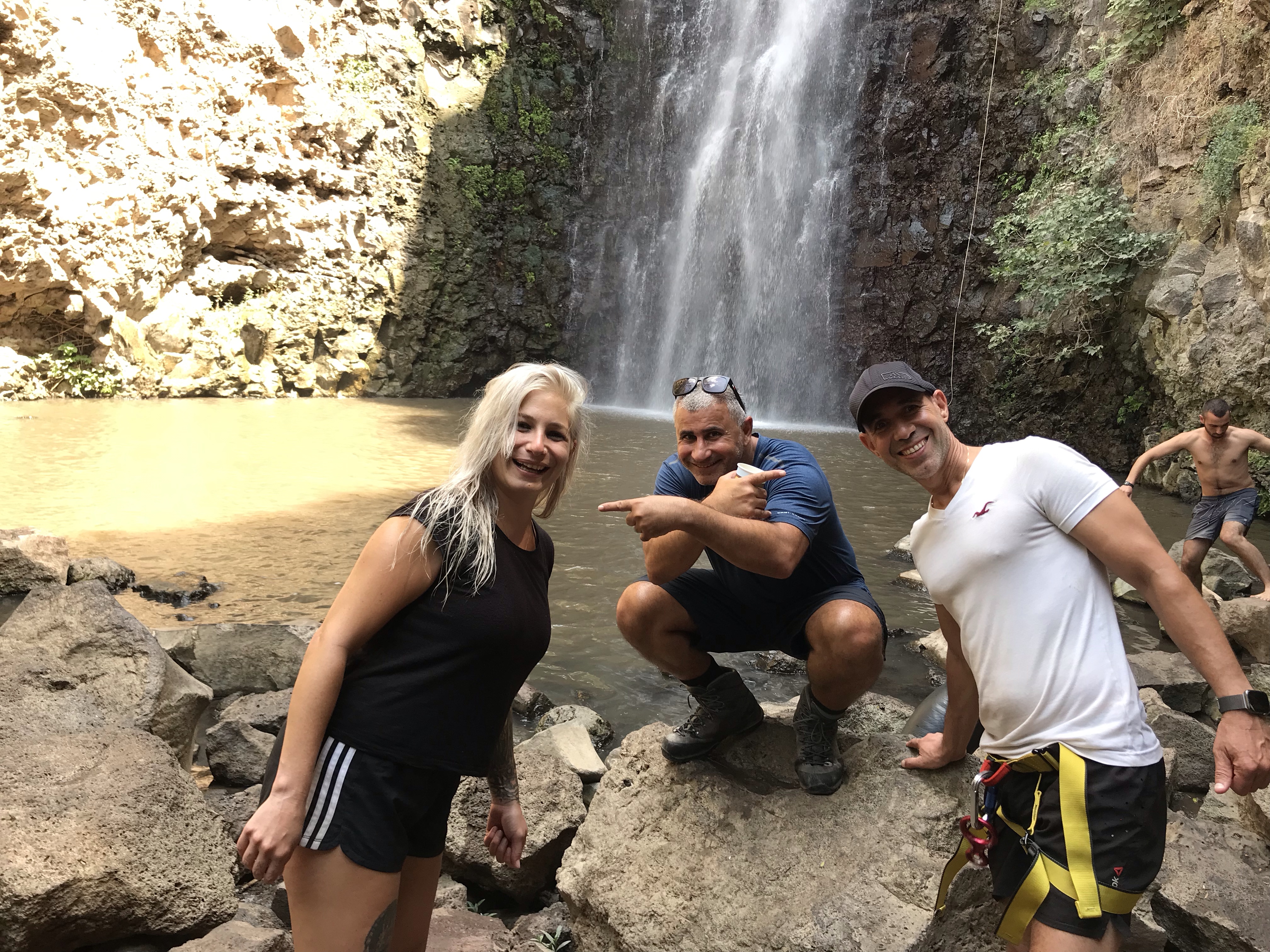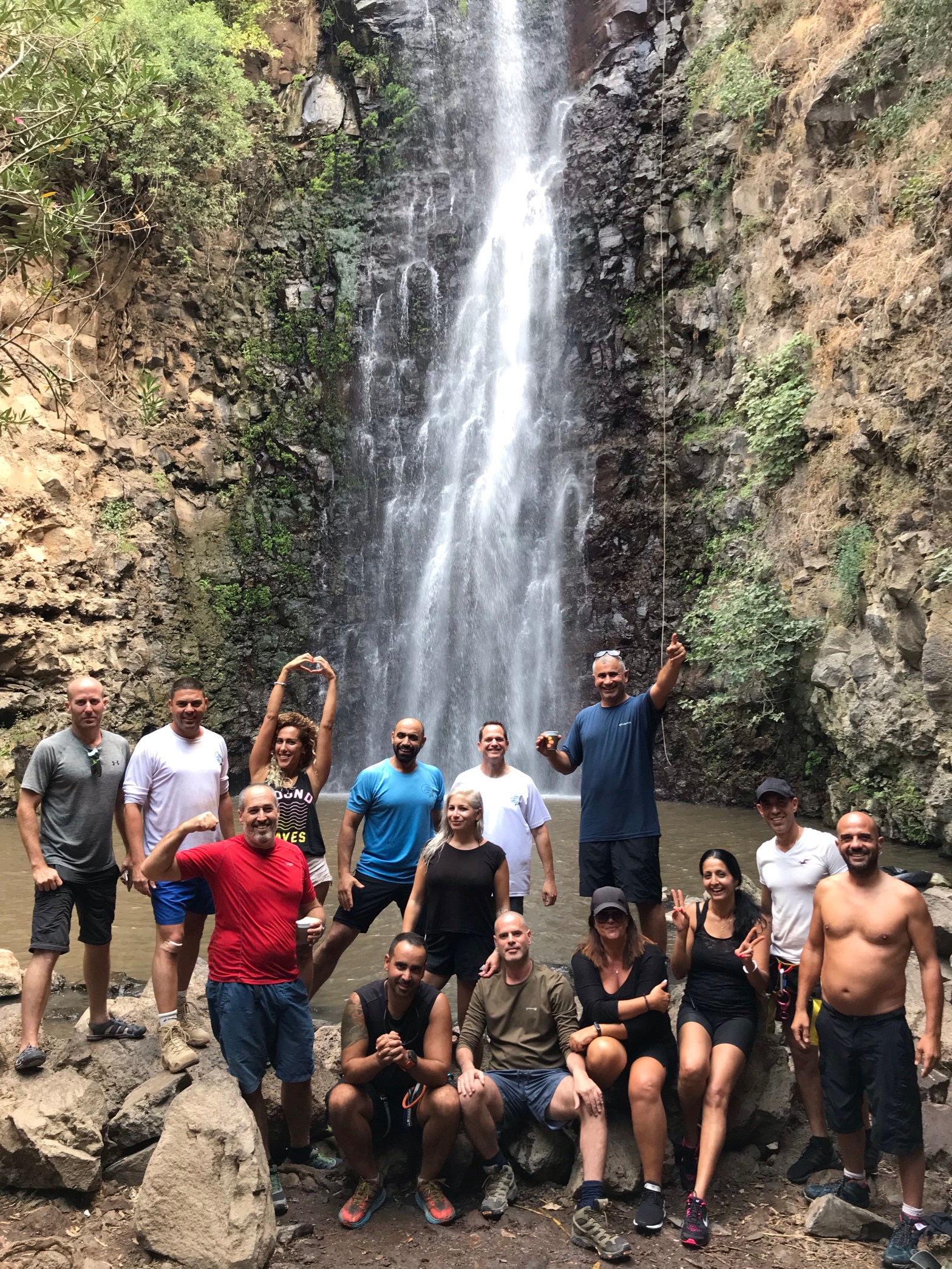 לאחר שכולם גלשו, דאגנו להוריד הציוד והתיקים והצטרפנו לקבוצה בבריכת המפל , התארגנו על ארוחה קלילה, סנדוויצ’ים , חטיפים , חטיפי בריאות וסיימנו עם קפה טוב ופלחי אבטיח. בסיום דאגנו לצילום משותף על רקע המפל העוצמתי.