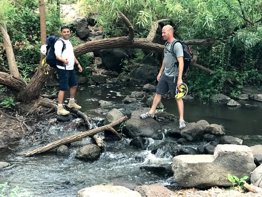 המשך הליכה קצרה עד ההגעה לנקודת תצפית העליונה למפל ג’ילבון , התארגנות על ציוד סנפלינג, והסבר של גיא גולן על אופן וצורת הגלישה ותחילת גלישה במפל המדהים.