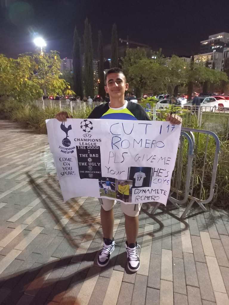 בצאת השבת , הגענו לאצטדיון סמי עופר, נכנסו דרך שער F , גוש 29a שורה 5 , כיסאות 430 -431 קרוב לכר הדשא…. הקבוצות רומא וטוטנהם עלו על כר הדשא והחשמל באוויר הורגש, לרטות בגודל טבעי את השחקנים המפורסמים , הארי קיין, סון , קובלסקי, רומרו, דיבאלה ועוד…. הבן הכין פלקט גדול עם פירגון לקבוצתו האהובה טוטנהם ולשחקן רומרו.. כל המשחק הרים שלט והריע…..