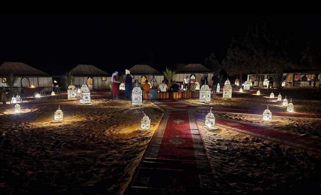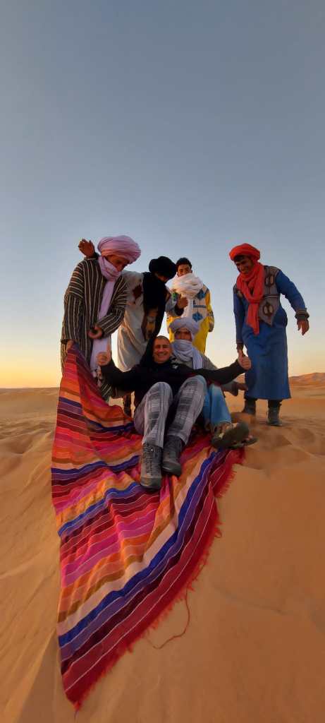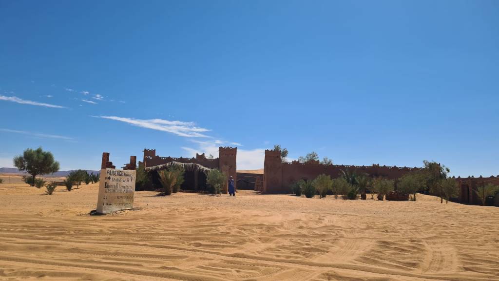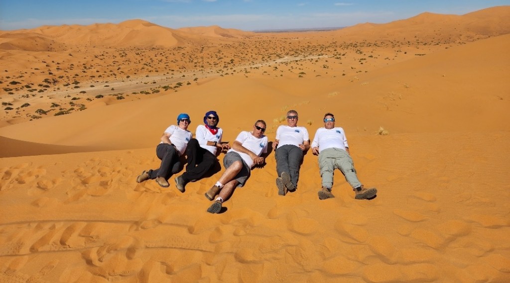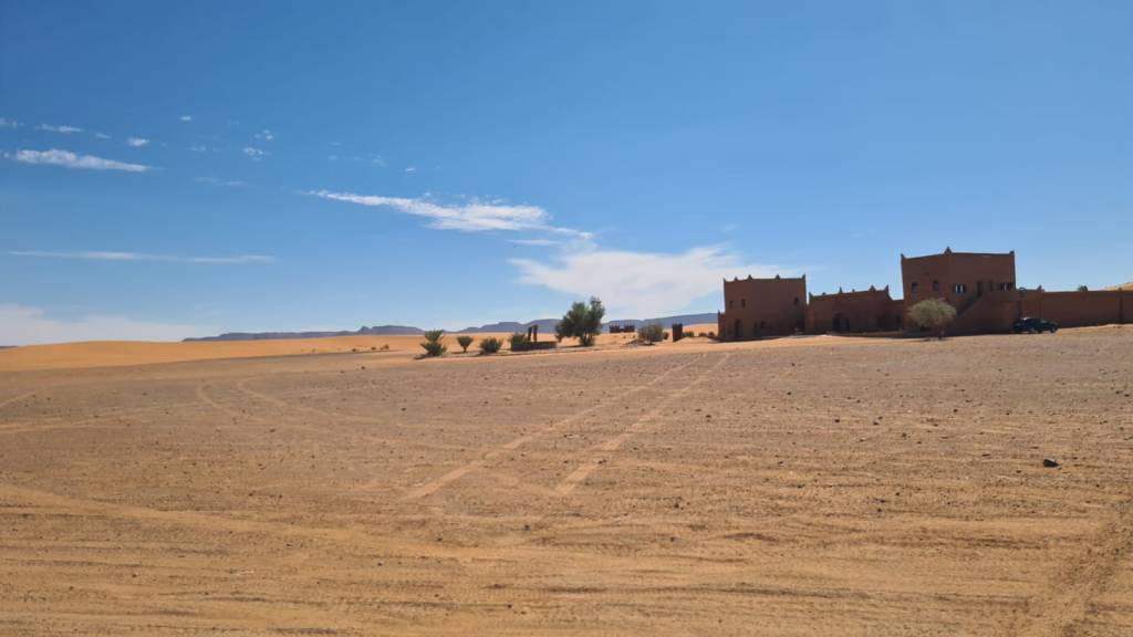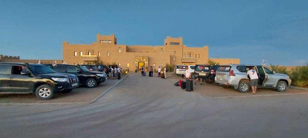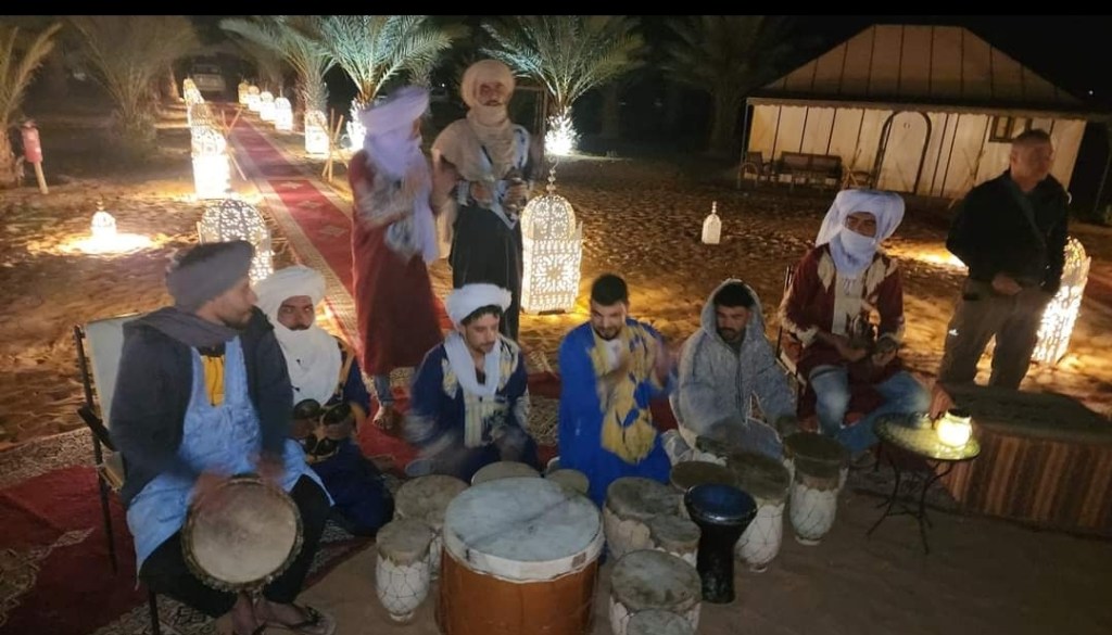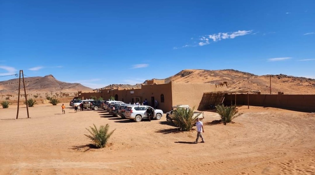 לאחר תדלוק הרכבים המשכנו בנסיעת שטח בדרכנו לעיירה מרזוגה… בדרך הסמוכה לגבול אלג'יריה פנצר באחד הגיפים , אודי השתלט על העניינים ולאחר תיקון מקצועי המשכנו בנסיעה לאורחן הלילה….הגענו לאורחן בשם אואזיס ,מדובר באורחן הנמצא בלב הסהרה מדהים ביופיו ובפינוק שמציע …. התארגנות באוהלים המפנקים, ארוחת ערב ולאחריה חאפלה מרוקאית…